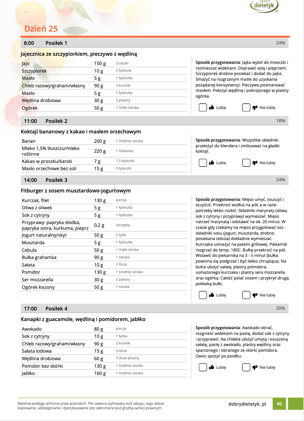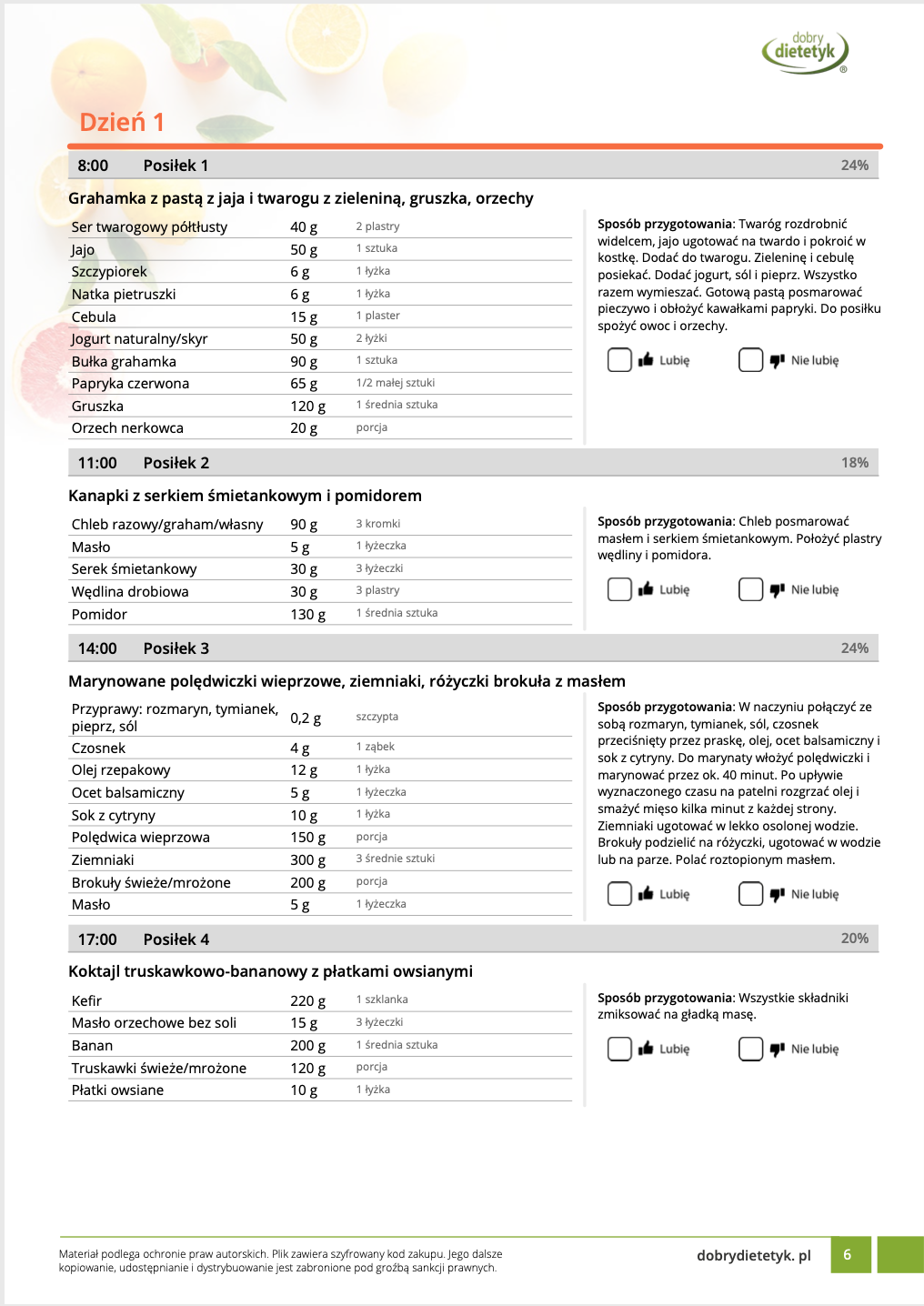 • w formie precyzyjnych jadłospisów wielodniowych (na każdy dzień miesiąca jest opracowany osobny jadłospis). Tutaj nie musisz zastanawiać się co zjeść każdego dnia, gdyż będziesz mieć dokładnie wszystko rozplanowane.