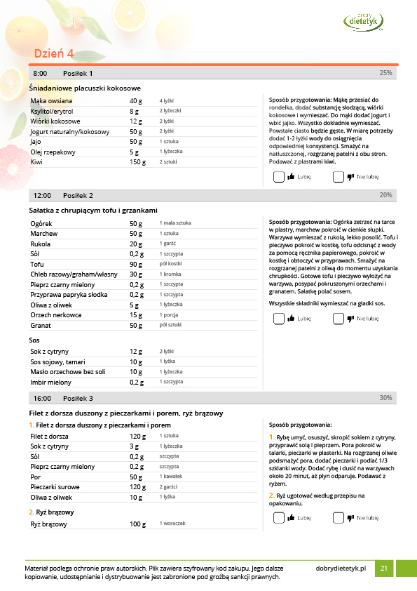 w formie precyzyjnych jadłospisów wielodniowych (na każdy dzień miesiąca jest opracowany osobny jadłospis). Tutaj nie musisz zastanawiać się co zjeść każdego dnia, gdyż będziesz mieć dokładnie wszystko rozplanowane.