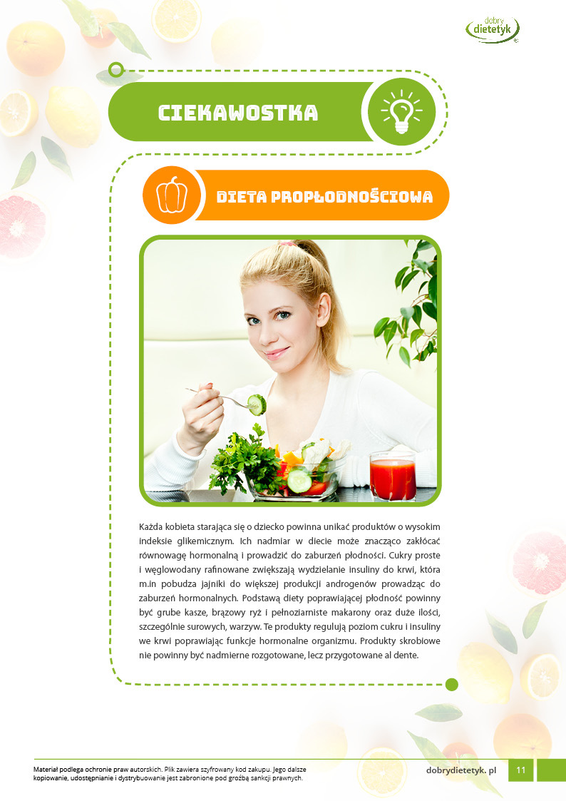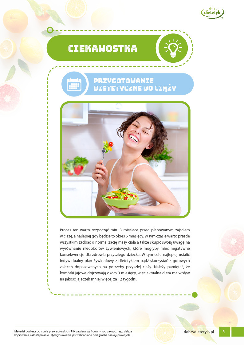 Ten wyjątkowy 30-dniowy program dietetyczny został specjalnie opracowany przez zespół dietetyków dla kobiet planujących ciążę. Jest to dieta przygotowana w celu poprawienia płodności oparta na żywności naturalnej, niskoprzetworzonej, bogatej w składniki pokarmowe potrzebne do osiągnięcia równowagi hormonalnej, funkcji reprodukcyjnych i późniejszego, prawidłowego rozwoju płodu.  Jest to dieta bardzo pomocna w zrównoważeniu istniejących problemów z płodnością oraz zgromadzeniu zapasów składników odżywczych. W diecie położono szczególny nacisk m.in. na: odpowiednią podaż pełnowartościowego białka, wymaganych kwasów tłuszczowych, wysoką zawartość żelaza, folianów, witaminy B12, cynku i wielu innych składników odżywczych.