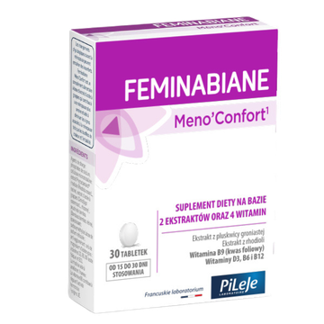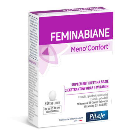 Feminabiane Meno’Confort to suplement diety na bazie ekstraktów z pluskwicy groniastej i rhodioli oraz witamin (D3, B6, kwasu foliowego, B12). Ekstrakt z pluskwicy groniastej przyczynia się do złagodzenia uciążliwych objawów menopauzy, takich jak uderzenia gorąca i drażliwość. Rhodiola wpływa na poprawę nastroju. Witamina B6 pomaga regulować poziom hormonów. Przeciwwskazania: Nie zaleca się stosowania przez kobiety w ciąży i karmiące piersią oraz osobom, które zmagają się z dolegliwościami wątroby.
