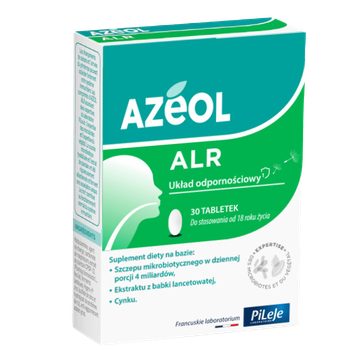 Suplement diety na bazie tyndalizowanego szczepu mikrobiotycznego Latilactobacillus sakei LA907 w dziennej porcji 4 miliardów w tabletce, ekstraktu z babki lancetowatej i cynku. Zmieniające się pory roku mogą znacznie obciążyć układ odpornościowy. Tabletki Azeol ALR łączą w sobie dwa obszary specjalistycznej wiedzy laboratorium PiLeJe: wiedzę na temat mikrobioty i wiedzę na temat roślin. Tyndalizowany szczep mikrobiotyczny i ekstrakt z babki lancetowatej zostały rygorystycznie wyselekcjonowane i tworzą wyjątkowe połączenie. Cynk przyczynia się do prawidłowego funkcjonowania układu odpornościowego. Przeciwwskazania: niewskazany u kobiet w ciąży lub karmiących oraz dzieci. Nie przekraczać zalecanej porcji do spożycia w ciągu dnia.Rekomendowany do suplementacji w: